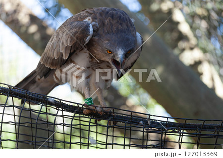 A large bird of prey screams while sitting on a branch