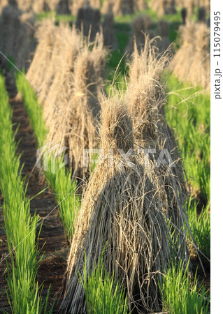 快晴の青空をバックに牧草ロールが並ぶ風景を撮影
