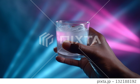 Celebratory drink enjoyed during vibrant party atmosphere with colorful lights