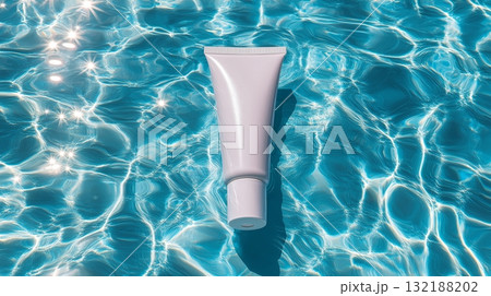 Sunscreen tube mockup floats on shimmering pool water under bright sunlight