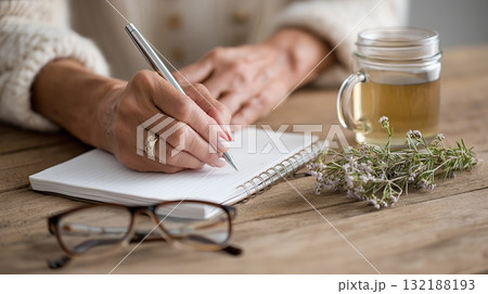 Writing in a notebook with tea and flowers on a cozy wooden table