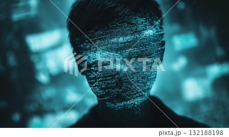Portrait of a young person with a digital text overlay in a futuristic setting