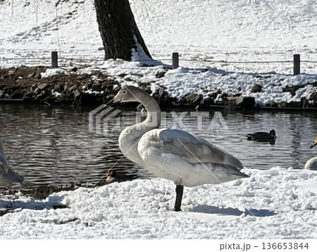 下野市烏ヶ森の池の雪の中の白鳥