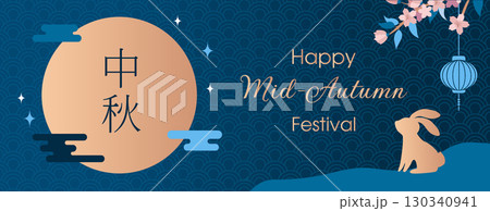 Mid Autumn Festival Greetings Banner in Blue and Gold. Silhouette of rabbit, moon, flowers, clouds, stars, pattern. Vector illustration.