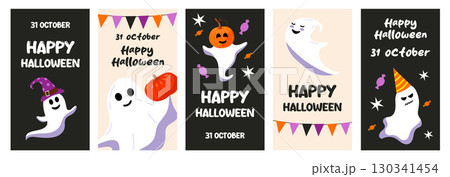 Vector collection of Halloween backgrounds. Halloween poster set. Cute ghosts, candies and festive garlands.