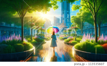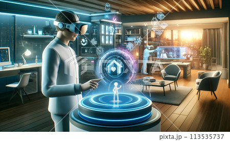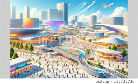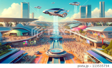 近未来の夏のリゾートホテルのテラスでくつろぐ人々