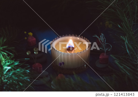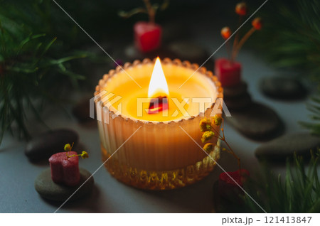 a beautiful scented candle in a transparent holder burns on a dark background. High quality photo