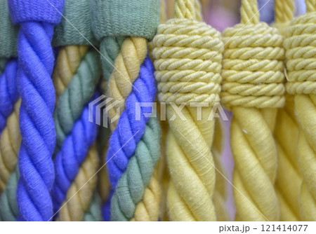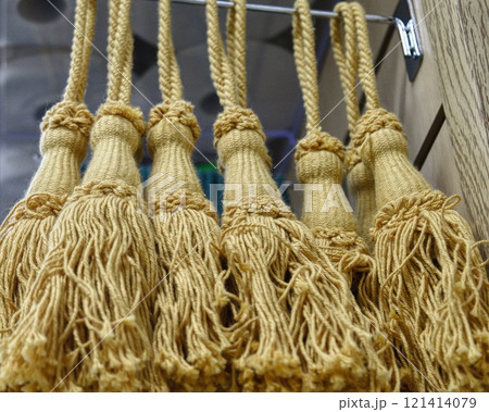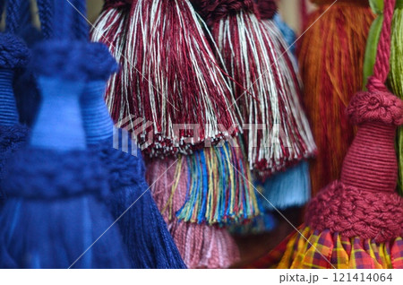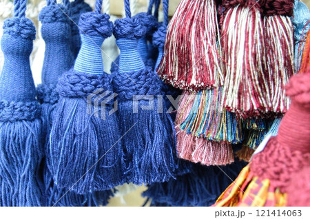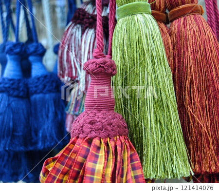 decorative brush pendants for the canopy. colored tassels made of thread for hanging on curtains. items for needlework sewing and embroidery for home comfort and window decoration. High quality photo