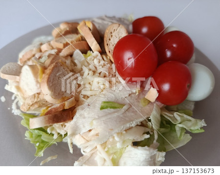 Fresh chicken caesar salad with crisp lettuce, grilled chicken breast slices, cherry tomatoes, crunchy croutons, and grated parmesan cheese, a nutritious meal option