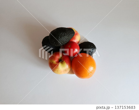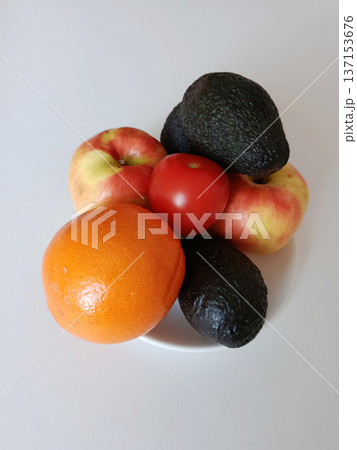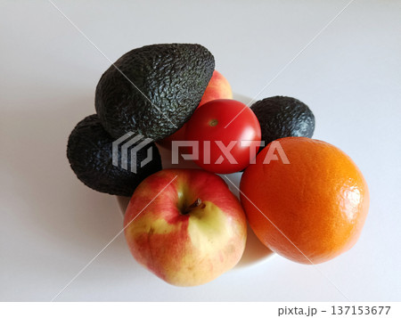 Fresh avocados, apples, tomato, and orange artfully arranged on a white plate, showcasing a vibrant assortment of healthy fruits and vegetables for a balanced diet
