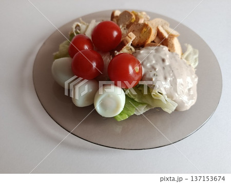 Fresh garden salad with crisp lettuce, juicy cherry tomatoes, halved quail eggs, crunchy croutons and savory dressing on a neutral plate - a healthy, colorful appetizer or light meal