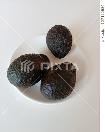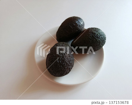 Three ripe hass avocados with dark green, bumpy skin resting on a white plate, highlighting a healthy diet, fresh nutrition, and natural food ingredients
