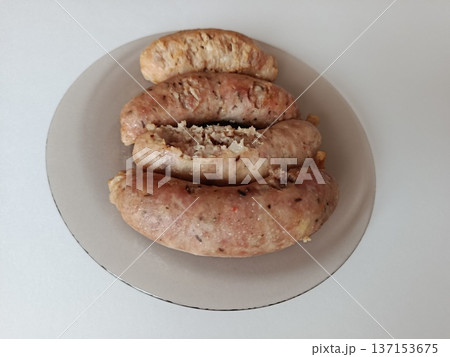 Cooked fresh sausages on a transparent plate, showcasing delicious homemade meat food prepared for a healthy meal, focusing on protein-rich nutrition and culinary enjoyment