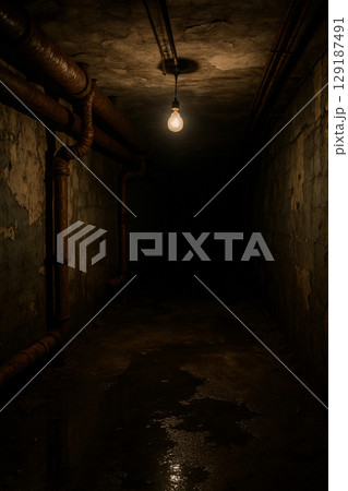 錆びたパイプと裸電球のある暗い地下通路 ホラー 心霊 廃墟写真
