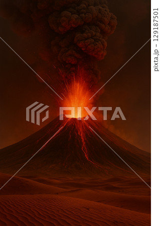 砂漠地帯で噴火する火山の大規模な爆発と噴煙 自然災害写真