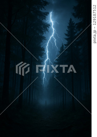深い森に落ちる稲妻と暗闇を照らす雷光の迫力