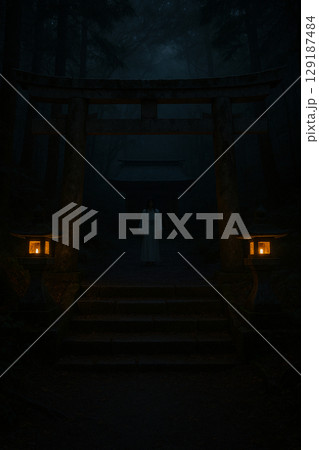 夜の神社の鳥居に立つ白装束の人影 ホラー 心霊 和風ホラー写真