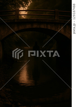 夕暮れの橋の下に立つ人影 ホラー 心霊 怪奇現象の風景写真