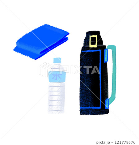 水の入ったペットボトルと水筒とタオルのイラスト