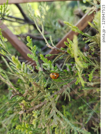 Bright red ladybug on leaf.