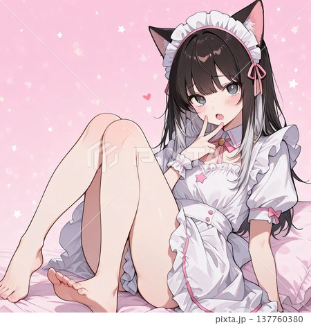 猫耳メイドのかわいい女の子が座っているイラスト