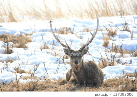 雪原のエゾシカ