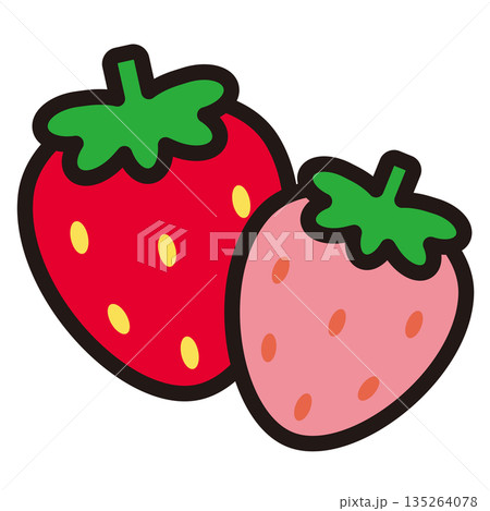 簡易的シンプルでかわいいベタ塗り素材の葉っぱ付き赤とピンクの2個のイチゴ線画ベクターイラストアイコン