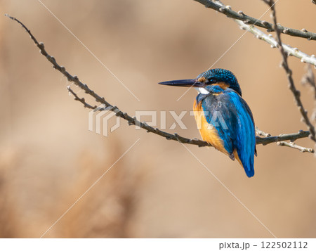 枝に止まるカワセミ、魚を狙う姿