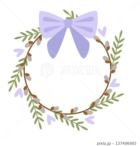 Spring Easter wreath with willow twigs and a bow. Vector illustration
