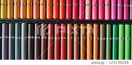 Close-up of neatly stacked colored pencils arranged in a gradient from green to brown and red tones. The glossy texture reflects light, creating a visually appealing pattern.