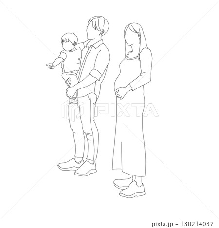 妊娠中の母と子供と父親が並ぶ三人家族の線画