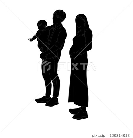 妊娠中の母と子供と父親が並ぶ三人家族のシルエット