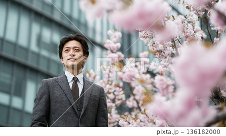 桜の下で新たなキャリアをスタートさせる日本人ビジネスマン