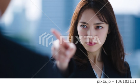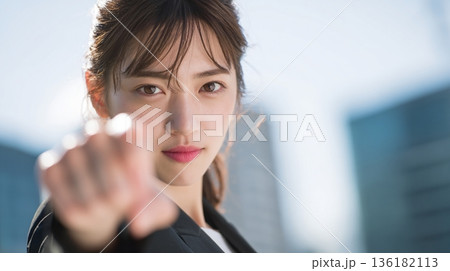 目標に向かって迷いなく指を差す日本人ビジネスウーマン