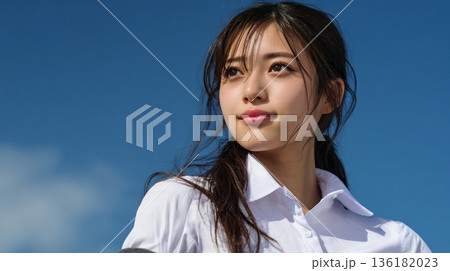 晴天の空の下、清々しい表情を見せる日本人の制服女子高校生