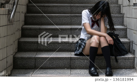 階段に座り込み、深く落ち込む制服姿の日本人女子学生