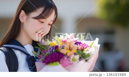 輝くような笑顔で花束を抱える日本人女子高生