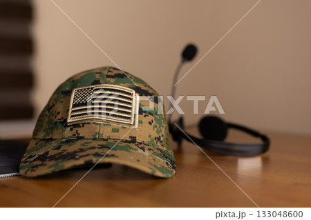 an American soldier sitting at a desk, wearing a military uniform and a headset