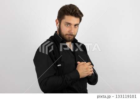 A priest in his church uniform with a cigarette in his mouth and a rosary in his hands