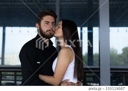 A man is embracing a woman while they are sitting together at an outdoor cafe
