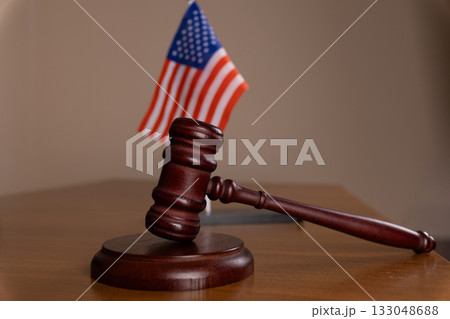 A judge writing notes on a book next to a gavel on a wooden desk in a courtroom
