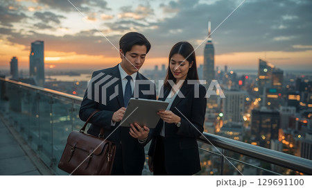 夕暮れの都市高層ビル屋上でタブレットを見ながら商談する日本人ビジネスパーソン