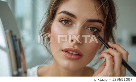ナチュラルメイクを仕上げる女性のクローズアップ