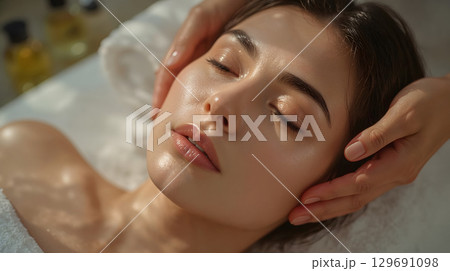極上のリラクゼーションを楽しむ日本人女性のフェイシャルマッサージ