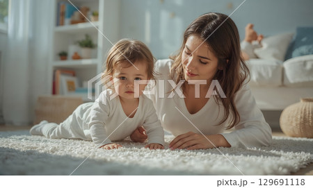 母親と幼い子供がリビングで遊ぶ温かい日常のひととき