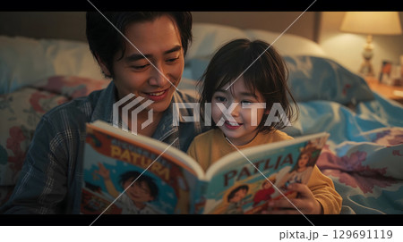 寝る前の読み聞かせを楽しむ父と娘の温かいひととき