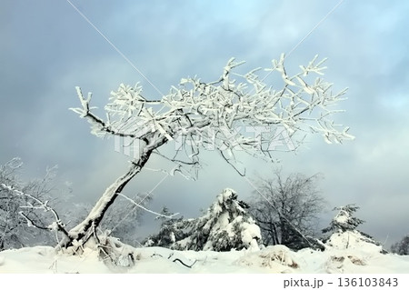 A solitary tree with snow on it with the pale winter sky in background
