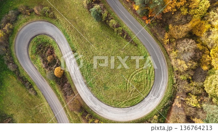 Aerial view of a winding narrow "S" shaped road leading through a green meadow and autumn forest.