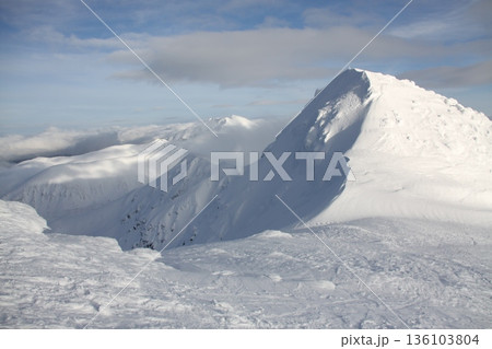 A mountain covered in snow with a cloudy sky in the background