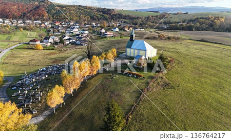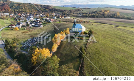 The church stands on a hill with a colorful forest in the background